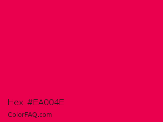 Hex #ea004e Color is a normal rose color and the nearest color is UA Red #d9004c. Hex code #ea004e and RGB value is rgb(234,0,78). In RGB color space, this color is composed of 92% red, 0% green, 31% blue, In CMYK color space, this color is composed of 0% cyan, 100% magenta, 67% yellow , 8% black , In HSL color space, this color has a hue angle of 340° , 100% saturation and 46% lightness.
