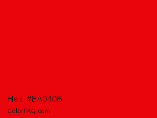 Hex #ea040b Color is a normal red color and the nearest color is KU Crimson #e8000d. Hex code #ea040b and RGB value is rgb(234,4,11). In RGB color space, this color is composed of 92% red, 2% green, 4% blue, In CMYK color space, this color is composed of 0% cyan, 98% magenta, 95% yellow , 8% black , In HSL color space, this color has a hue angle of 358° , 97% saturation and 47% lightness.