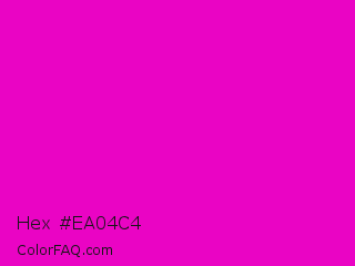 Hex #ea04c4 Color is a normal magenta color and the nearest color is Shocking Pink #fc0fc0. Hex code #ea04c4 and RGB value is rgb(234,4,196). In RGB color space, this color is composed of 92% red, 2% green, 77% blue, In CMYK color space, this color is composed of 0% cyan, 98% magenta, 16% yellow , 8% black , In HSL color space, this color has a hue angle of 310° , 97% saturation and 47% lightness.