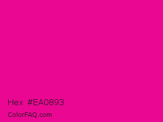 Hex #ea0893 Color is a normal magenta color and the nearest color is Hollywood Cerise #f400a1. Hex code #ea0893 and RGB value is rgb(234,8,147). In RGB color space, this color is composed of 92% red, 3% green, 58% blue, In CMYK color space, this color is composed of 0% cyan, 97% magenta, 37% yellow , 8% black , In HSL color space, this color has a hue angle of 323° , 93% saturation and 47% lightness.