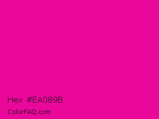 Hex #ea089b Color is a normal magenta color and the nearest color is Hollywood Cerise #f400a1. Hex code #ea089b and RGB value is rgb(234,8,155). In RGB color space, this color is composed of 92% red, 3% green, 61% blue, In CMYK color space, this color is composed of 0% cyan, 97% magenta, 34% yellow , 8% black , In HSL color space, this color has a hue angle of 321° , 93% saturation and 47% lightness.