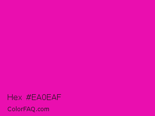 Hex #ea0eaf Color is a normal magenta color and the nearest color is Hollywood Cerise #f400a1. Hex code #ea0eaf and RGB value is rgb(234,14,175). In RGB color space, this color is composed of 92% red, 5% green, 69% blue, In CMYK color space, this color is composed of 0% cyan, 94% magenta, 25% yellow , 8% black , In HSL color space, this color has a hue angle of 316° , 89% saturation and 49% lightness.