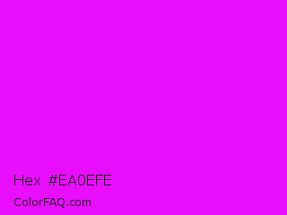 Hex #ea0efe Color is a normal magenta color and the nearest color is Phlox #df00ff. Hex code #ea0efe and RGB value is rgb(234,14,254). In RGB color space, this color is composed of 92% red, 5% green, 100% blue, In CMYK color space, this color is composed of 8% cyan, 94% magenta, 0% yellow , 0% black , In HSL color space, this color has a hue angle of 295° , 99% saturation and 53% lightness.