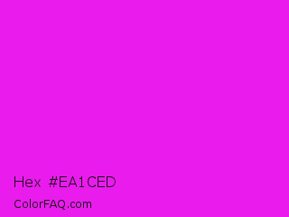 Hex #ea1ced Color is a normal magenta color and the nearest color is Phlox #df00ff. Hex code #ea1ced and RGB value is rgb(234,28,237). In RGB color space, this color is composed of 92% red, 11% green, 93% blue, In CMYK color space, this color is composed of 1% cyan, 88% magenta, 0% yellow , 7% black , In HSL color space, this color has a hue angle of 299° , 85% saturation and 52% lightness.