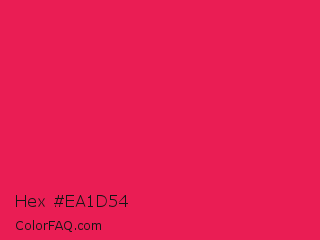 Hex #ea1d54 Color is a normal rose color and the nearest color is Red Crayola #ee204d. Hex code #ea1d54 and RGB value is rgb(234,29,84). In RGB color space, this color is composed of 92% red, 11% green, 33% blue, In CMYK color space, this color is composed of 0% cyan, 88% magenta, 64% yellow , 8% black , In HSL color space, this color has a hue angle of 344° , 83% saturation and 52% lightness.