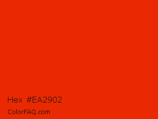 Hex #ea2902 Color is a normal red color and the nearest color is Ferrari Red #ff2800. Hex code #ea2902 and RGB value is rgb(234,41,2). In RGB color space, this color is composed of 92% red, 16% green, 1% blue, In CMYK color space, this color is composed of 0% cyan, 82% magenta, 99% yellow , 8% black , In HSL color space, this color has a hue angle of 10° , 98% saturation and 46% lightness.