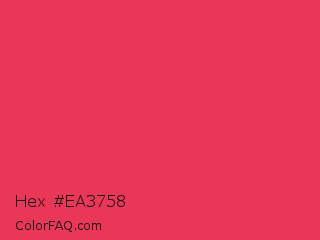 Hex #ea3758 Color is a normal red color and the nearest color is Desire #ea3c53. Hex code #ea3758 and RGB value is rgb(234,55,88). In RGB color space, this color is composed of 92% red, 22% green, 35% blue, In CMYK color space, this color is composed of 0% cyan, 76% magenta, 62% yellow , 8% black , In HSL color space, this color has a hue angle of 349° , 81% saturation and 57% lightness.