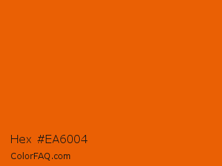 Hex #ea6004 Color is a normal orange color and the nearest color is Spanish Orange #e86100. Hex code #ea6004 and RGB value is rgb(234,96,4). In RGB color space, this color is composed of 92% red, 38% green, 2% blue, In CMYK color space, this color is composed of 0% cyan, 59% magenta, 98% yellow , 8% black , In HSL color space, this color has a hue angle of 24° , 97% saturation and 47% lightness.