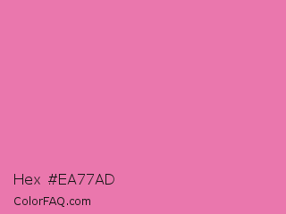 Hex #ea77ad Color is a light rose color and the nearest color is Carissma #ea88a8. Hex code #ea77ad and RGB value is rgb(234,119,173). In RGB color space, this color is composed of 92% red, 47% green, 68% blue, In CMYK color space, this color is composed of 0% cyan, 49% magenta, 26% yellow , 8% black , In HSL color space, this color has a hue angle of 332° , 73% saturation and 69% lightness.