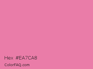 Hex #ea7ca8 Color is a light rose color and the nearest color is Carissma #ea88a8. Hex code #ea7ca8 and RGB value is rgb(234,124,168). In RGB color space, this color is composed of 92% red, 49% green, 66% blue, In CMYK color space, this color is composed of 0% cyan, 47% magenta, 28% yellow , 8% black , In HSL color space, this color has a hue angle of 336° , 72% saturation and 70% lightness.