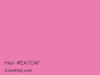 Hex #ea7caf Color is a light rose color and the nearest color is Carissma #ea88a8. Hex code #ea7caf and RGB value is rgb(234,124,175). In RGB color space, this color is composed of 92% red, 49% green, 69% blue, In CMYK color space, this color is composed of 0% cyan, 47% magenta, 25% yellow , 8% black , In HSL color space, this color has a hue angle of 332° , 72% saturation and 70% lightness.
