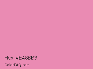 Hex #ea8bb3 Color is a light rose color and the nearest color is Light Thulian Pink #e68fac. Hex code #ea8bb3 and RGB value is rgb(234,139,179). In RGB color space, this color is composed of 92% red, 55% green, 70% blue, In CMYK color space, this color is composed of 0% cyan, 41% magenta, 24% yellow , 8% black , In HSL color space, this color has a hue angle of 335° , 69% saturation and 73% lightness.
