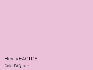 Hex #eac1d8 Color is a very light magenta color and the nearest color is Melanie #e4c2d5. Hex code #eac1d8 and RGB value is rgb(234,193,216). In RGB color space, this color is composed of 92% red, 76% green, 85% blue, In CMYK color space, this color is composed of 0% cyan, 18% magenta, 8% yellow , 8% black , In HSL color space, this color has a hue angle of 326° , 49% saturation and 84% lightness.