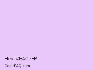 Hex #eac7fb Color is a very light purple color and the nearest color is French Lilac #ecc7ee. Hex code #eac7fb and RGB value is rgb(234,199,251). In RGB color space, this color is composed of 92% red, 78% green, 98% blue, In CMYK color space, this color is composed of 7% cyan, 21% magenta, 0% yellow , 2% black , In HSL color space, this color has a hue angle of 280° , 87% saturation and 88% lightness.