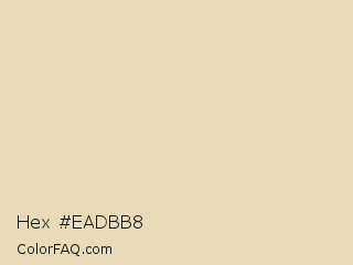 Hex #eadbb8 Color is a very light orange color and the nearest color is Raffia #eadab8. Hex code #eadbb8 and RGB value is rgb(234,219,184). In RGB color space, this color is composed of 92% red, 86% green, 72% blue, In CMYK color space, this color is composed of 0% cyan, 6% magenta, 21% yellow , 8% black , In HSL color space, this color has a hue angle of 42° , 54% saturation and 82% lightness.