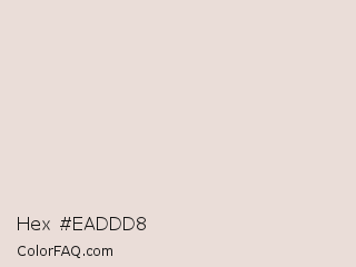 Hex #eaddd8 Color is a very light orange color and the nearest color is Bizarre #eededa. Hex code #eaddd8 and RGB value is rgb(234,221,216). In RGB color space, this color is composed of 92% red, 87% green, 85% blue, In CMYK color space, this color is composed of 0% cyan, 6% magenta, 8% yellow , 8% black , In HSL color space, this color has a hue angle of 17° , 30% saturation and 88% lightness.