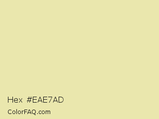 Hex #eae7ad Color is a light yellow color and the nearest color is Pale Goldenrod #eee8aa. Hex code #eae7ad and RGB value is rgb(234,231,173). In RGB color space, this color is composed of 92% red, 91% green, 68% blue, In CMYK color space, this color is composed of 0% cyan, 1% magenta, 26% yellow , 8% black , In HSL color space, this color has a hue angle of 57° , 59% saturation and 80% lightness.