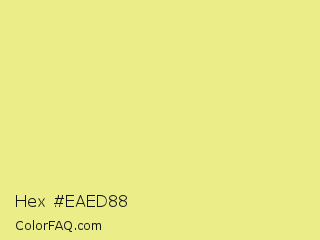 Hex #eaed88 Color is a light yellow color and the nearest color is Key Lime #e8f48c. Hex code #eaed88 and RGB value is rgb(234,237,136). In RGB color space, this color is composed of 92% red, 93% green, 53% blue, In CMYK color space, this color is composed of 1% cyan, 0% magenta, 43% yellow , 7% black , In HSL color space, this color has a hue angle of 62° , 74% saturation and 73% lightness.