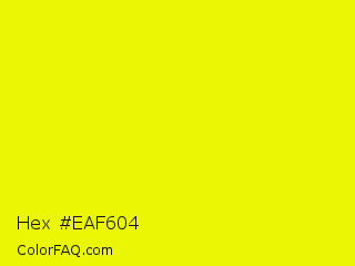 Hex #eaf604 Color is a normal yellow color and the nearest color is Lemon Lime #e3ff00. Hex code #eaf604 and RGB value is rgb(234,246,4). In RGB color space, this color is composed of 92% red, 96% green, 2% blue, In CMYK color space, this color is composed of 5% cyan, 0% magenta, 98% yellow , 4% black , In HSL color space, this color has a hue angle of 63° , 97% saturation and 49% lightness.