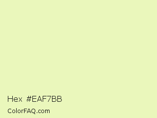 Hex #eaf7bb Color is a very light lime color and the nearest color is Tusk #eef3c3. Hex code #eaf7bb and RGB value is rgb(234,247,187). In RGB color space, this color is composed of 92% red, 97% green, 73% blue, In CMYK color space, this color is composed of 5% cyan, 0% magenta, 24% yellow , 3% black , In HSL color space, this color has a hue angle of 73° , 79% saturation and 85% lightness.