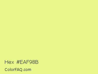 Hex #eaf98b Color is a light yellow color and the nearest color is Key Lime #e8f48c. Hex code #eaf98b and RGB value is rgb(234,249,139). In RGB color space, this color is composed of 92% red, 98% green, 55% blue, In CMYK color space, this color is composed of 6% cyan, 0% magenta, 44% yellow , 2% black , In HSL color space, this color has a hue angle of 68° , 90% saturation and 76% lightness.