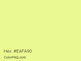Hex #eafa90 Color is a light yellow color and the nearest color is Key Lime #e8f48c. Hex code #eafa90 and RGB value is rgb(234,250,144). In RGB color space, this color is composed of 92% red, 98% green, 56% blue, In CMYK color space, this color is composed of 6% cyan, 0% magenta, 42% yellow , 2% black , In HSL color space, this color has a hue angle of 69° , 91% saturation and 77% lightness.