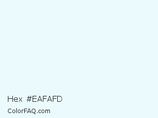 Hex #eafafd Color is a almost white cyan color and the nearest color is Lily White #e7f8ff. Hex code #eafafd and RGB value is rgb(234,250,253). In RGB color space, this color is composed of 92% red, 98% green, 99% blue, In CMYK color space, this color is composed of 8% cyan, 1% magenta, 0% yellow , 1% black , In HSL color space, this color has a hue angle of 189° , 83% saturation and 95% lightness.