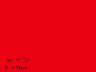Hex #eb0111 Color is a normal red color and the nearest color is KU Crimson #e8000d. Hex code #eb0111 and RGB value is rgb(235,1,17). In RGB color space, this color is composed of 92% red, 0% green, 7% blue, In CMYK color space, this color is composed of 0% cyan, 100% magenta, 93% yellow , 8% black , In HSL color space, this color has a hue angle of 356° , 99% saturation and 46% lightness.