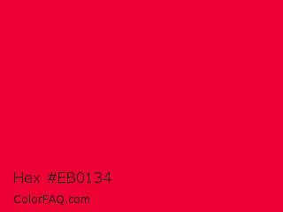 Hex #eb0134 Color is a normal red color and the nearest color is Red Munsell #f2003c. Hex code #eb0134 and RGB value is rgb(235,1,52). In RGB color space, this color is composed of 92% red, 0% green, 20% blue, In CMYK color space, this color is composed of 0% cyan, 100% magenta, 78% yellow , 8% black , In HSL color space, this color has a hue angle of 347° , 99% saturation and 46% lightness.
