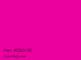 Hex #eb019d Color is a normal magenta color and the nearest color is Hollywood Cerise #f400a1. Hex code #eb019d and RGB value is rgb(235,1,157). In RGB color space, this color is composed of 92% red, 0% green, 62% blue, In CMYK color space, this color is composed of 0% cyan, 100% magenta, 33% yellow , 8% black , In HSL color space, this color has a hue angle of 320° , 99% saturation and 46% lightness.
