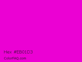 Hex #eb01d3 Color is a normal magenta color and the nearest color is Purple Pizzazz #ff00cc. Hex code #eb01d3 and RGB value is rgb(235,1,211). In RGB color space, this color is composed of 92% red, 0% green, 83% blue, In CMYK color space, this color is composed of 0% cyan, 100% magenta, 10% yellow , 8% black , In HSL color space, this color has a hue angle of 306° , 99% saturation and 46% lightness.