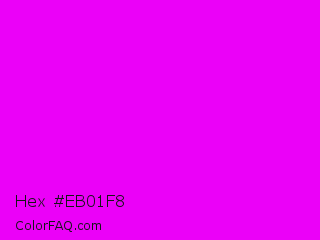 Hex #eb01f8 Color is a normal magenta color and the nearest color is Phlox #df00ff. Hex code #eb01f8 and RGB value is rgb(235,1,248). In RGB color space, this color is composed of 92% red, 0% green, 97% blue, In CMYK color space, this color is composed of 5% cyan, 100% magenta, 0% yellow , 3% black , In HSL color space, this color has a hue angle of 297° , 99% saturation and 49% lightness.