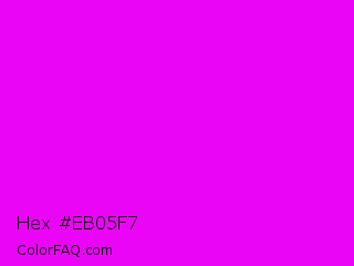 Hex #eb05f7 Color is a normal magenta color and the nearest color is Phlox #df00ff. Hex code #eb05f7 and RGB value is rgb(235,5,247). In RGB color space, this color is composed of 92% red, 2% green, 97% blue, In CMYK color space, this color is composed of 5% cyan, 98% magenta, 0% yellow , 3% black , In HSL color space, this color has a hue angle of 297° , 96% saturation and 49% lightness.