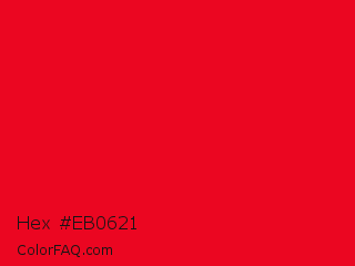 Hex #eb0621 Color is a normal red color and the nearest color is Spanish Red #e60026. Hex code #eb0621 and RGB value is rgb(235,6,33). In RGB color space, this color is composed of 92% red, 2% green, 13% blue, In CMYK color space, this color is composed of 0% cyan, 97% magenta, 86% yellow , 8% black , In HSL color space, this color has a hue angle of 353° , 95% saturation and 47% lightness.