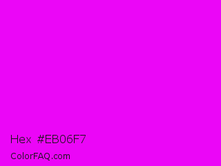 Hex #eb06f7 Color is a normal magenta color and the nearest color is Phlox #df00ff. Hex code #eb06f7 and RGB value is rgb(235,6,247). In RGB color space, this color is composed of 92% red, 2% green, 97% blue, In CMYK color space, this color is composed of 5% cyan, 98% magenta, 0% yellow , 3% black , In HSL color space, this color has a hue angle of 297° , 95% saturation and 50% lightness.