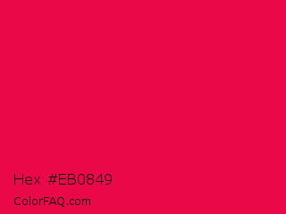 Hex #eb0849 Color is a normal rose color and the nearest color is Red Ribbon #ed0a3f. Hex code #eb0849 and RGB value is rgb(235,8,73). In RGB color space, this color is composed of 92% red, 3% green, 29% blue, In CMYK color space, this color is composed of 0% cyan, 97% magenta, 69% yellow , 8% black , In HSL color space, this color has a hue angle of 343° , 93% saturation and 48% lightness.