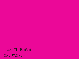 Hex #eb0898 Color is a normal magenta color and the nearest color is Hollywood Cerise #f400a1. Hex code #eb0898 and RGB value is rgb(235,8,152). In RGB color space, this color is composed of 92% red, 3% green, 60% blue, In CMYK color space, this color is composed of 0% cyan, 97% magenta, 35% yellow , 8% black , In HSL color space, this color has a hue angle of 322° , 93% saturation and 48% lightness.
