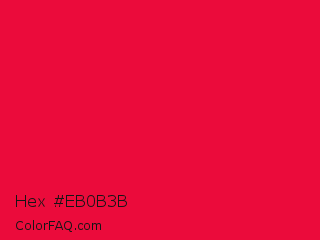 Hex #eb0b3b Color is a normal red color and the nearest color is Red Ribbon #ed0a3f. Hex code #eb0b3b and RGB value is rgb(235,11,59). In RGB color space, this color is composed of 92% red, 4% green, 23% blue, In CMYK color space, this color is composed of 0% cyan, 95% magenta, 75% yellow , 8% black , In HSL color space, this color has a hue angle of 347° , 91% saturation and 48% lightness.