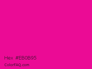 Hex #eb0b95 Color is a normal magenta color and the nearest color is Hollywood Cerise #f400a1. Hex code #eb0b95 and RGB value is rgb(235,11,149). In RGB color space, this color is composed of 92% red, 4% green, 58% blue, In CMYK color space, this color is composed of 0% cyan, 95% magenta, 37% yellow , 8% black , In HSL color space, this color has a hue angle of 323° , 91% saturation and 48% lightness.