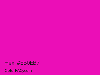 Hex #eb0eb7 Color is a normal magenta color and the nearest color is Shocking Pink #fc0fc0. Hex code #eb0eb7 and RGB value is rgb(235,14,183). In RGB color space, this color is composed of 92% red, 5% green, 72% blue, In CMYK color space, this color is composed of 0% cyan, 94% magenta, 22% yellow , 8% black , In HSL color space, this color has a hue angle of 314° , 89% saturation and 49% lightness.