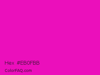 Hex #eb0fbb Color is a normal magenta color and the nearest color is Shocking Pink #fc0fc0. Hex code #eb0fbb and RGB value is rgb(235,15,187). In RGB color space, this color is composed of 92% red, 6% green, 73% blue, In CMYK color space, this color is composed of 0% cyan, 94% magenta, 20% yellow , 8% black , In HSL color space, this color has a hue angle of 313° , 88% saturation and 49% lightness.