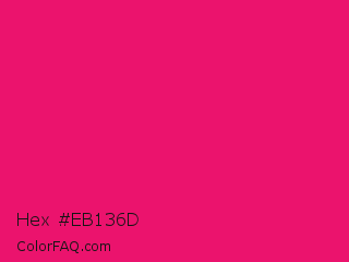 Hex #eb136d Color is a normal rose color and the nearest color is Ruby #e0115f. Hex code #eb136d and RGB value is rgb(235,19,109). In RGB color space, this color is composed of 92% red, 7% green, 43% blue, In CMYK color space, this color is composed of 0% cyan, 92% magenta, 54% yellow , 8% black , In HSL color space, this color has a hue angle of 335° , 85% saturation and 50% lightness.