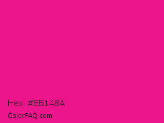 Hex #eb148a Color is a normal magenta color and the nearest color is Barbie Pink #e0218a. Hex code #eb148a and RGB value is rgb(235,20,138). In RGB color space, this color is composed of 92% red, 8% green, 54% blue, In CMYK color space, this color is composed of 0% cyan, 91% magenta, 41% yellow , 8% black , In HSL color space, this color has a hue angle of 327° , 84% saturation and 50% lightness.