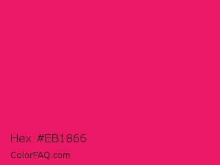 Hex #eb1866 Color is a normal rose color and the nearest color is Ruby #e0115f. Hex code #eb1866 and RGB value is rgb(235,24,102). In RGB color space, this color is composed of 92% red, 9% green, 40% blue, In CMYK color space, this color is composed of 0% cyan, 90% magenta, 57% yellow , 8% black , In HSL color space, this color has a hue angle of 338° , 84% saturation and 51% lightness.