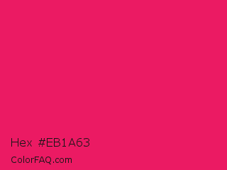 Hex #eb1a63 Color is a normal rose color and the nearest color is Ruby #e0115f. Hex code #eb1a63 and RGB value is rgb(235,26,99). In RGB color space, this color is composed of 92% red, 10% green, 39% blue, In CMYK color space, this color is composed of 0% cyan, 89% magenta, 58% yellow , 8% black , In HSL color space, this color has a hue angle of 339° , 84% saturation and 51% lightness.