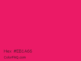 Hex #eb1a66 Color is a normal rose color and the nearest color is Razzmatazz #e3256b. Hex code #eb1a66 and RGB value is rgb(235,26,102). In RGB color space, this color is composed of 92% red, 10% green, 40% blue, In CMYK color space, this color is composed of 0% cyan, 89% magenta, 57% yellow , 8% black , In HSL color space, this color has a hue angle of 338° , 84% saturation and 51% lightness.