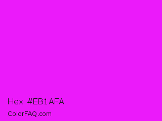 Hex #eb1afa Color is a normal magenta color and the nearest color is Phlox #df00ff. Hex code #eb1afa and RGB value is rgb(235,26,250). In RGB color space, this color is composed of 92% red, 10% green, 98% blue, In CMYK color space, this color is composed of 6% cyan, 90% magenta, 0% yellow , 2% black , In HSL color space, this color has a hue angle of 296° , 96% saturation and 54% lightness.