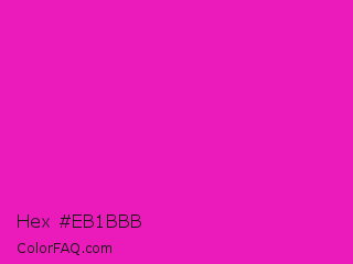 Hex #eb1bbb Color is a normal magenta color and the nearest color is Shocking Pink #fc0fc0. Hex code #eb1bbb and RGB value is rgb(235,27,187). In RGB color space, this color is composed of 92% red, 11% green, 73% blue, In CMYK color space, this color is composed of 0% cyan, 89% magenta, 20% yellow , 8% black , In HSL color space, this color has a hue angle of 314° , 84% saturation and 51% lightness.