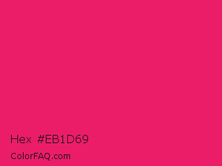 Hex #eb1d69 Color is a normal rose color and the nearest color is Razzmatazz #e3256b. Hex code #eb1d69 and RGB value is rgb(235,29,105). In RGB color space, this color is composed of 92% red, 11% green, 41% blue, In CMYK color space, this color is composed of 0% cyan, 88% magenta, 55% yellow , 8% black , In HSL color space, this color has a hue angle of 338° , 84% saturation and 52% lightness.