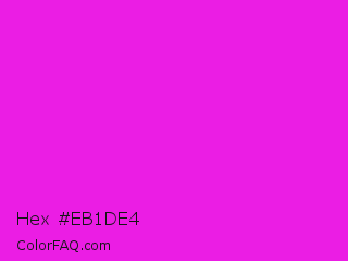 Hex #eb1de4 Color is a normal magenta color and the nearest color is Hot Magenta #ff1dce. Hex code #eb1de4 and RGB value is rgb(235,29,228). In RGB color space, this color is composed of 92% red, 11% green, 89% blue, In CMYK color space, this color is composed of 0% cyan, 88% magenta, 3% yellow , 8% black , In HSL color space, this color has a hue angle of 302° , 84% saturation and 52% lightness.